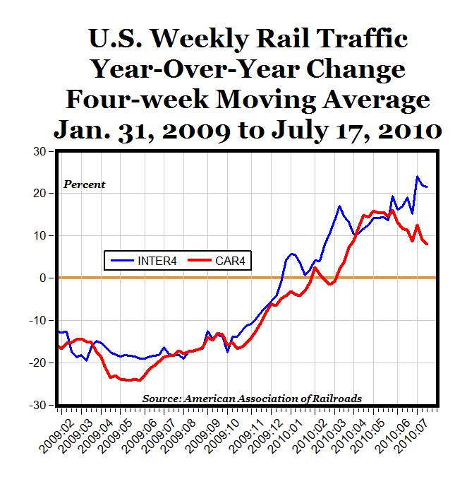 1. U.S. railroads originated 282,199 carloads for the week ending July 17, 2010, up 5.5% compared with the same week in 2009, but down 13.8% from pre-recession levels in 2008.